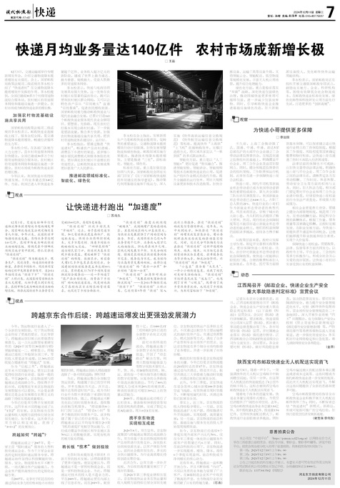 ■ 快递月均业务量达140亿件 农村市场成新增长极