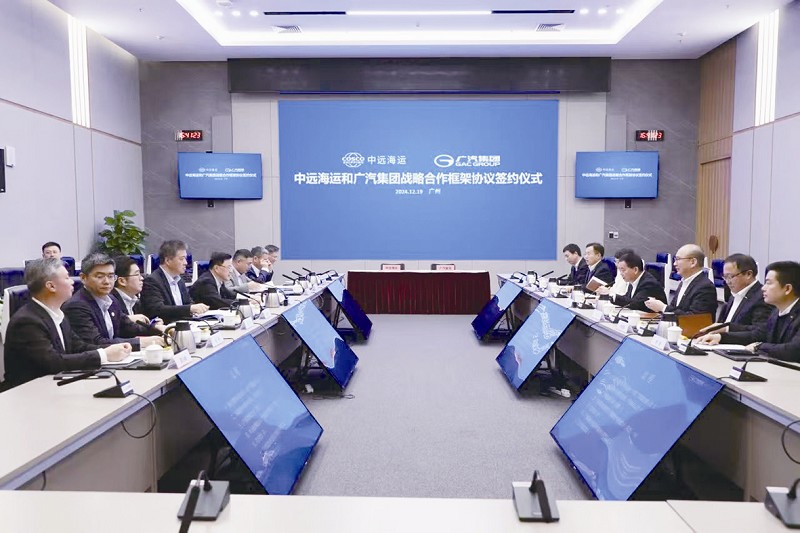 本报讯12月19日,中国远洋海运集团有限公司(以下简称中远海运集团)与广州汽车集团股份有限公司(以下简称广汽集团)在广汽集团番禺总部签署战略合作协议。在中远海运集团董事长万敏、广汽集团董事长曾庆洪的见证下,中远海运集团副总经理林戟、广汽集团副总经理郑衡分别代表双方签约。