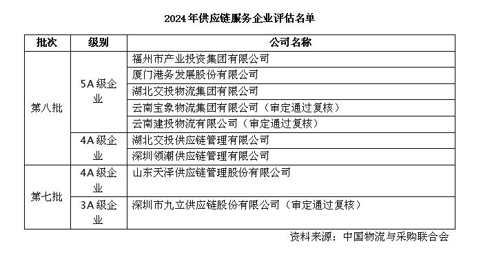 截至2024年12月,中国物流与采购联合会向社会陆续通告了八批A级供应链服务企业共26家,九批网络货运平台A级企业共81家,十二批星级冷链物流企业共119家。其中,2024年,中国物流预采购联合会依据《供应链服务企业分类与评估指标》 (T/CFLP 0020-2019)团体标准和中国物流与采购联合会供应链服务企业评估程序的要求,评估通过6家供应链服务企业,审定通过符合企业3家。