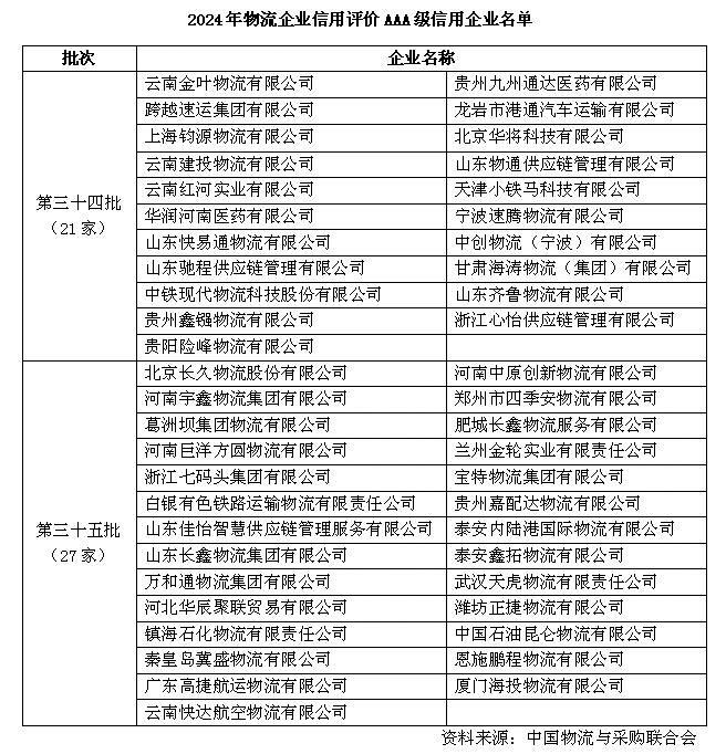 信用是品牌的立身之本,也是品牌可持续发展的基础。2024年中国物流与采购联合会信用专家委员会按照《物流企业信用信息管理办法》 《物流企业信用评级管理办法》等规定,共评出A级信用企业67家,其中AAA级信用企业48家、AA级信用企业19家。