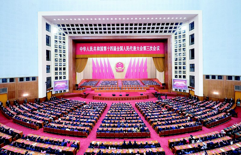 下午3时30分,李鸿忠宣布:中华人民共和国第十四届全国人民代表大会第三次会议闭幕。大会在雄壮的国歌声中结束。
