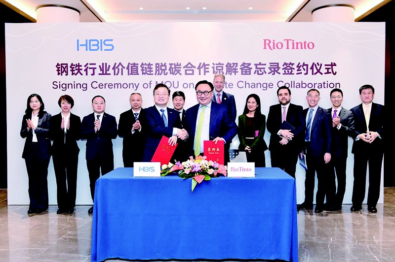 本报讯 3月24日,河钢集团(以下简称河钢)与力拓集团(以下简称力拓)钢铁行业价值链脱碳合作谅解备忘录签约仪式在北京举行,双方携手探索钢铁行业减碳路径,为促进行业可持续发展、应对全球气候变化贡献智慧与力量。河钢集团董事长刘键与力拓集团首席执行官石道成出席签约仪式并见签。