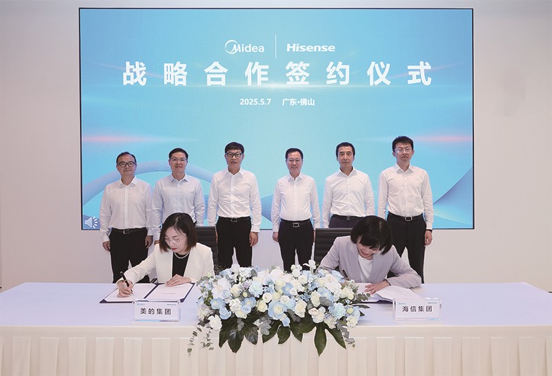 本报讯 5月7日,美的集团与海信集团签订战略合作协议,美的集团副总裁兼CFO钟铮、海信集团副总裁兼海信家电集团董事长高玉玲作为代表现场签约。