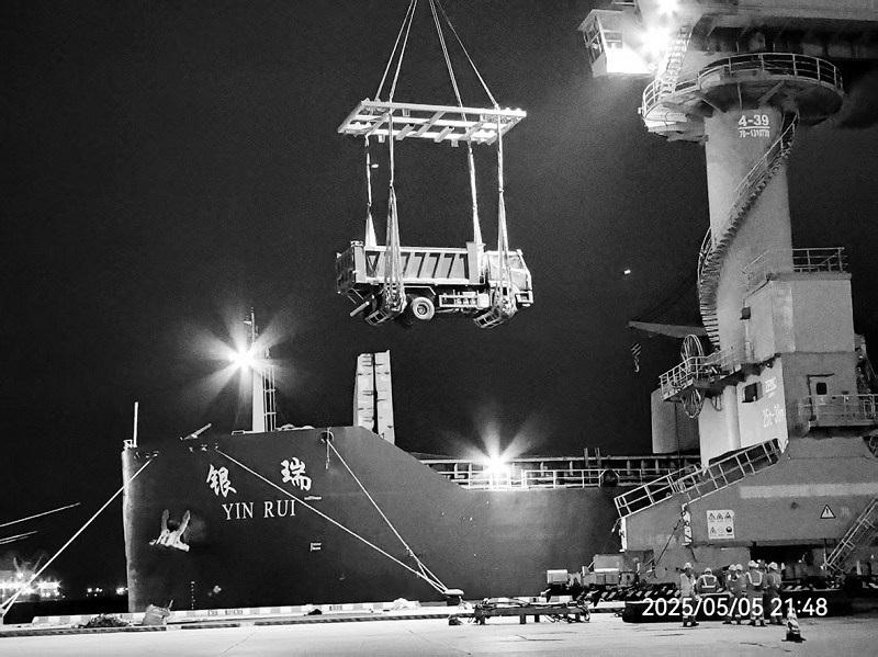 5月5日,在营口港鲅鱼圈港区66号泊位,“银瑞”轮正在进行紧张的装船作业。待作业完成后,它将承载60余辆、共计3600吨的工程车辆,从营口驶向东南亚。