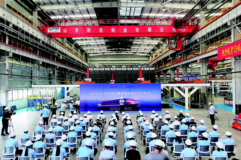 6月10日上午,由济宁能源集团山东新能船业有限公司(以下简称“新能船业”)为法国达飞海运集团建造的182TEU纯电动力集装箱运输船,在新能船业船体联合车间正式开工,这不仅是中国制造的纯电动力内河集装箱运输船首次出海,更标志着济宁能源集团以“绿色智造”之姿,强势叩开国际船舶制造市场的大门。