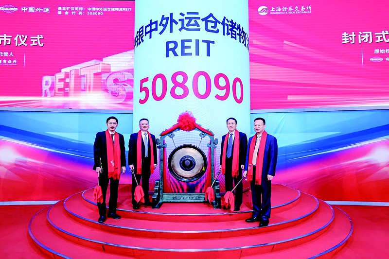 本报讯 7月29日,国内首单央企仓储物流基础设施不动产投资信托基金(REITs)——中银中外运仓储物流封闭式基础设施证券投资基金(基金简称:中银中外运仓储物流REIT)在上海证券交易所(以下简称“上交所”)挂牌上市。招商局集团副总经理冯波鸣、中国银行党委委员杨军、中国外运董事长张翼、中银基金执行总裁张家文共同敲响开市金锣,见证挂牌上市。