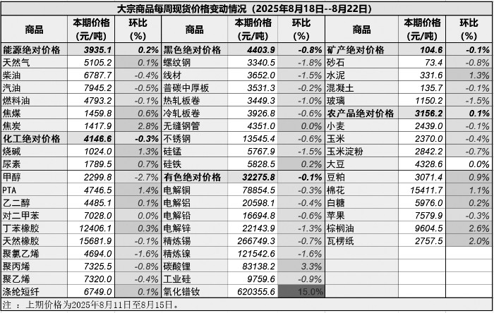 本报讯 据中国物流与采购联合会对全国50种重要大宗商品市场价格调查显示,本期价格(2025年8月18日至8月22日)与上期价格相比,19种(占比38%)大宗商品价格上涨,30种(占比60%)价格下跌,1种(占比2%)价格持平。