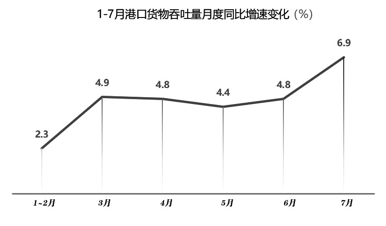 港口运营同样显示出加速态势,7月份完成港口货物吞吐量15.4亿吨,同比增长6.9%,其中内、外贸吞吐量同比分别增长7.6%和5.5%,港口集装箱吞吐量达2996万标箱。1~7月,累计完成港口货物吞吐量104.4亿吨、集装箱吞吐量2亿标箱,增长较快,发展喜人。