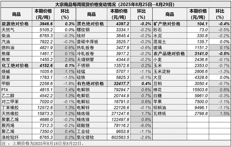 本报讯据中国物流与采购联合会对全国50种重要大宗商品市场价格调查显示,本期价格(2025年8月25日至8月29日)与上期价格相比,19种(占比38%)大宗商品价格上涨,28种(占比56%)价格下跌,3种(占比6%)价格持平。