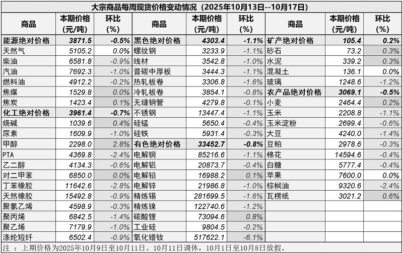 本报讯据中国物流与采购联合会对全国50种重要大宗商品市场价格调查显示,本期价格(2025年10月13日至10月17日)与上期价格相比,11种(占比22%)大宗商品价格上涨,36种(占比72%)价格下跌,3种(占比6%)价格持平。
