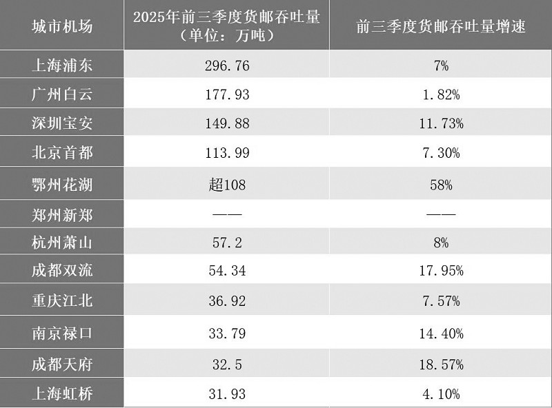 但不可忽视的是,花湖机场今年的货邮增速达到了58%,是十强中唯一一座增速超过20%的机场(新郑机场未披露前三季度具体数据)。