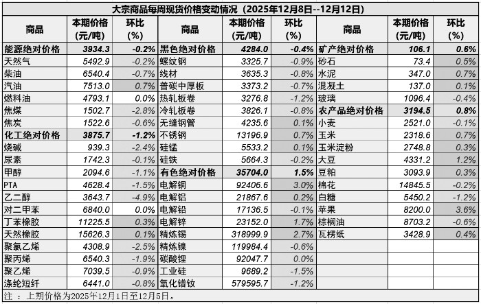 分行业看,有色、农产和矿产类大宗商品绝对价格较上期环比分别上涨1.5%、0.8%和0.6%;化工、黑色和能源类大宗商品绝对价格较上期环比下跌1.2%、0.4%和0.2%。分品种看,涨幅前三为苹果、电解铜和精炼锡,较上期环比分别上涨3.6%、3.0%和2.7%;跌幅前三为乙二醇、焦煤和聚氯乙烯,较上期环比分别下跌4.9%、2.8%和2.5%。(钟联)