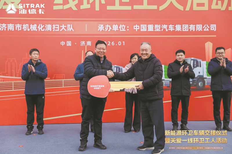 1月14日,“新能源环卫车辆交接仪式暨关爱一线环卫工人活动”在山东济南机械化清扫大队隆重举行。活动现场完成37辆中国重汽汕德卡新能源环卫车辆交付,并同步开展关爱一线环卫工人暖心行动,政企携手开启济南环卫事业绿色转型新篇章。