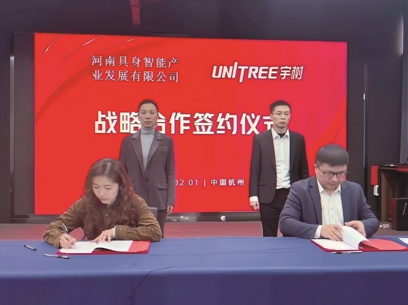 本报讯 2月1日,河南具身智能产业发展有限公司(以下简称河南具身智能公司)与宇树科技股份有限公司在杭州宇树科技总部举行战略合作签约仪式。宇树科技创始人、CEO王兴兴,联合创始人、COO陈立,具身智能公司董事长靳娜等共同出席并见证签约。