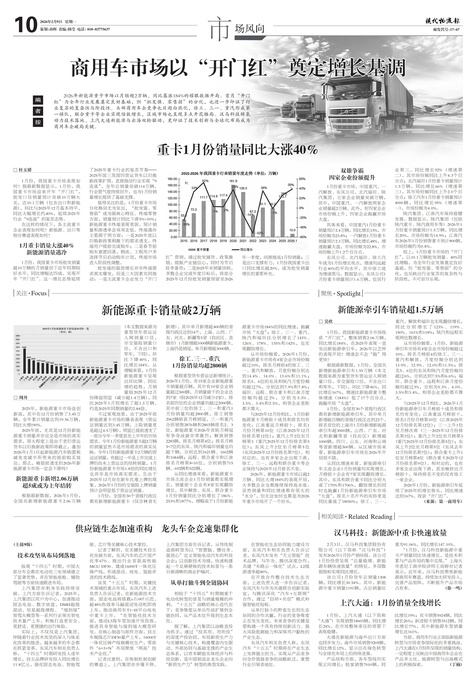 编者按 2026年新能源重卡市场以月销超2万辆、同比暴涨184%的耀眼数据开局。首月“开门红”为全年行业发展奠定良好基础,但“批发强、零售弱”的分化,也进一步印证了行业复苏的复杂性与阶段性。头部商用车企竞争也日趋白热化,徐工、三一、重汽形成第一梯队,联合重卡等企业实现倍数增长,区域市场也呈现多点开花格局。汉马科技醇氢动力技术落地、上汽大通新能源与出海双轮驱动,更印证了技术创新与全球化布局成为商用车企破局关键。