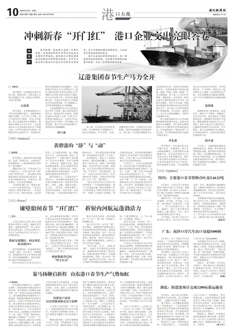 编者按 春节假期,各地港口呈现一片繁忙景象:沿海枢纽联动口岸单位与航运企业稳住外贸通道;能源港口以智能调度协同设备运行保障煤炭保供;内河节点通过部门联动与信息化手段提升过闸效率;长江中游枢纽强化船港协同、人机协同与绿色航运组织能力。 港口企业通过前置对接需求、统一调度资源和流程衔接,支撑春节假期物流链条不断档,交出一份亮眼的春运答卷。