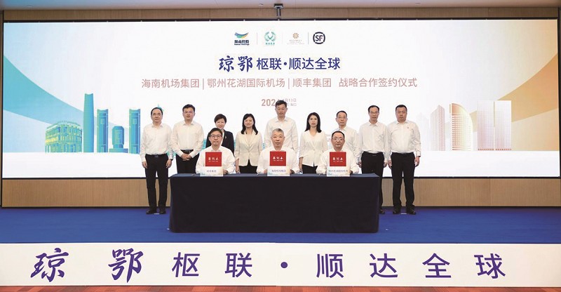本报讯(记者王伟 黄裕光 云蕾)4月13日,海南控股旗下海南机场集团有限公司(以下简称海南机场集团)与湖北国际物流机场有限公司(以下简称鄂州花湖机场)、深圳顺丰泰森控股(集团)有限公司(以下简称顺丰集团)在海口举行战略合作协议签约仪式,开启三方协同发展、共筑全球航空物流网络的全新篇章。