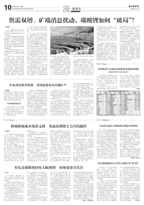 记者了解到,近期市场焦点集中在矿端。一方面,江西省自然资源厅官网近日发布了宜春4家锂矿采矿权出让收益评估报告,江西锂云母矿企面临换证问题,或将停产。据了解,此前宜春8家矿企均以开采主矿种为“陶瓷土”的采矿许可证生产锂矿,而随着宜春环保要求越来越严格、锂矿生产越来越规范,8家矿企陆续推进换证流程。余烁提醒,尽管从流程上看,后期矿山将进入换证阶段,可能临时停产,但矿企已提前开采采矿证额度,理论上对2026年的供给影响不大,应理性看待该消息的实际影响。