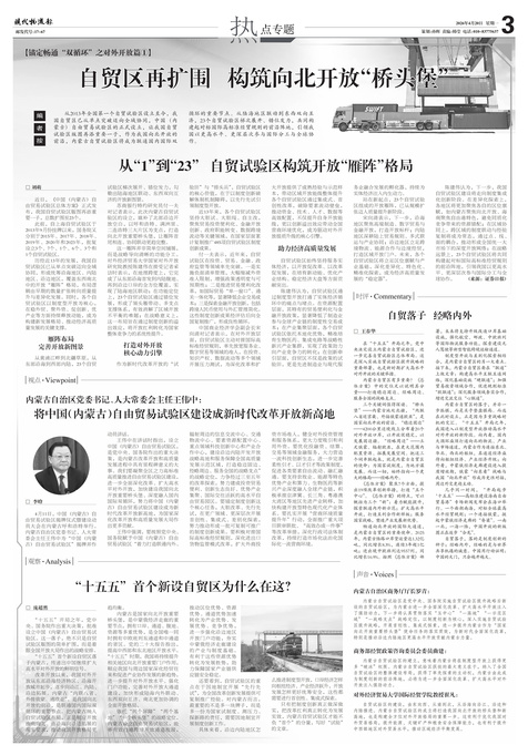 □ 王春华 在“十五五”开局之年,党中央决定设立内蒙古自贸试验区,进一步完善自贸试验区总体布局。这是深...